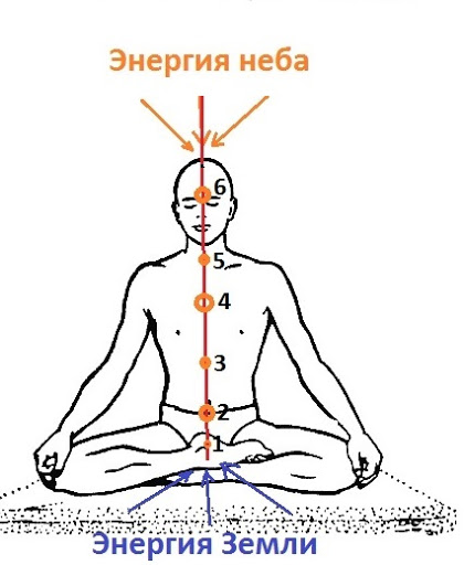 Наполняем Центральный канал энергией неба и Земли одновременно - 6 вв Наполняем ЭЦСС энергией неба и Земли одновременно - 6 вв (энергией неба через самую верхнюю точку центрального канала - точка 1 на схеме, а энергией земли через самую нижнюю точку центрального канала - в промежности)